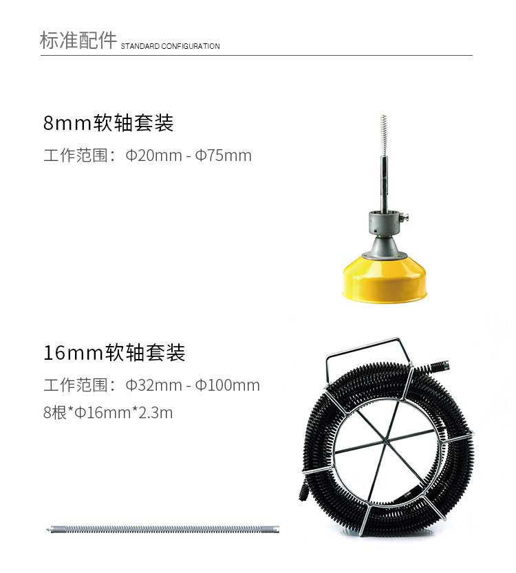 A75G疏通機(jī)采用壓力摩擦離合器三瓣結(jié)構(gòu),可以輕松地使機(jī)器處于工作和待機(jī)兩種狀態(tài),安全可靠,結(jié)構(gòu)簡單輕巧,移動(dòng)方便,可以使用8mm軟軸、l6mm軟軸,對(duì)于疏通清洗槽盆、衛(wèi)生間、樓宇等管道堵塞的首選設(shè)備。