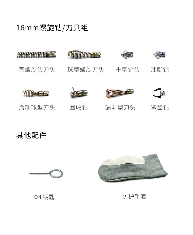 16mm刀頭套裝(活動(dòng)球型刀頭、直螺旋頭刀頭、球型螺旋刀頭、油脂鉆、十字鉆頭、回收鉆、漏斗型刀頭、鯊齒鉆/各1個(gè))、防護(hù)手套1雙、鑰匙1個(gè)、軟軸放置框1個(gè)